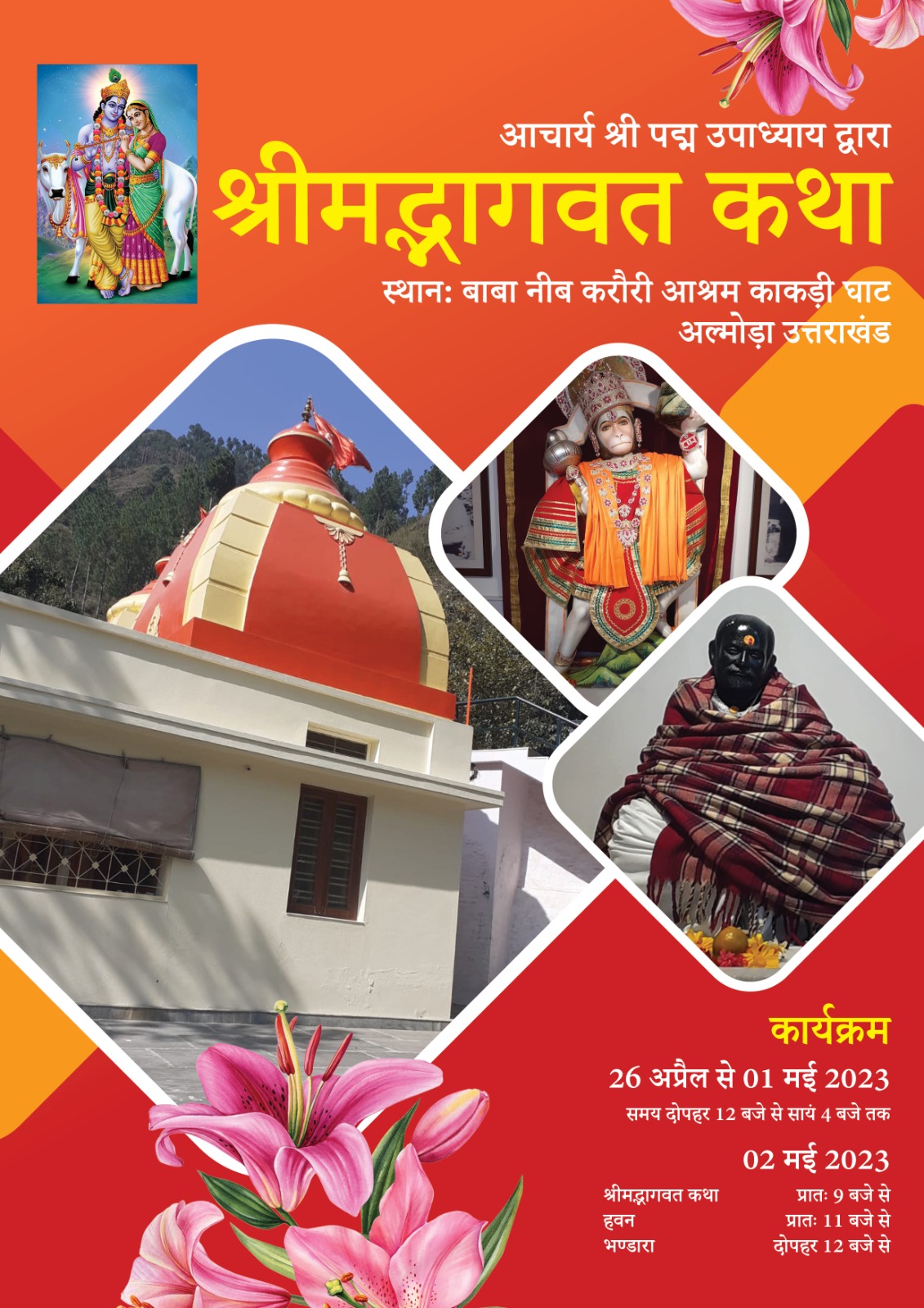अल्मोड़ा हल्द्वानी हाईवे पर काकड़ीघाट क्षेत्र में जीवनदायिनी कोसी नदी के तट पर स्थित बाबा नीम करौली आश्रम में धार्मिक अनुष्ठान की तैयारी तेज हो गई है। 26 अप्रैल को विधि विधान से पूजा अर्चना के साथ श्रीमद् भागवत कथा का श्रीगणेश होगा। मंदिर समिति ने बाबा भक्तों से अधिक से अधिक संख्या में कार्यक्रम में भाग लेने का आह्वान किया है।